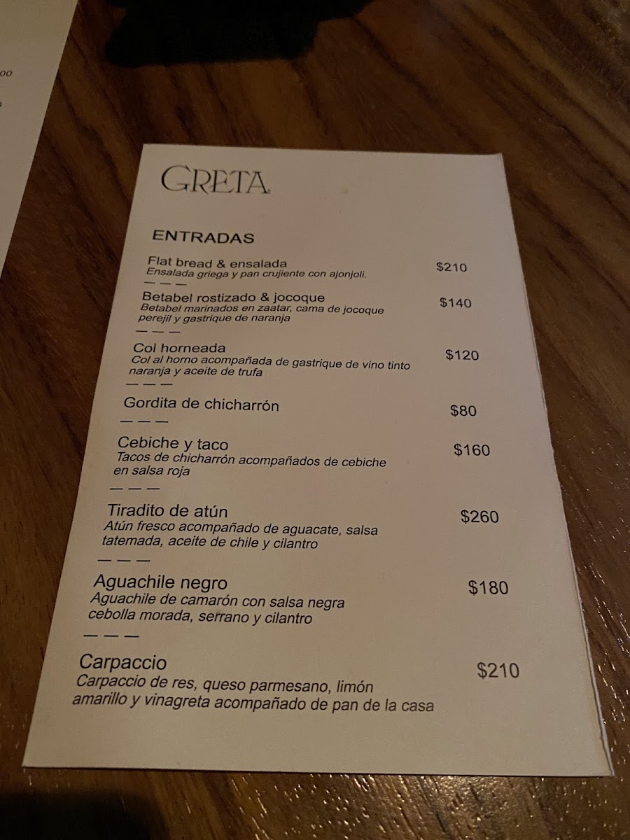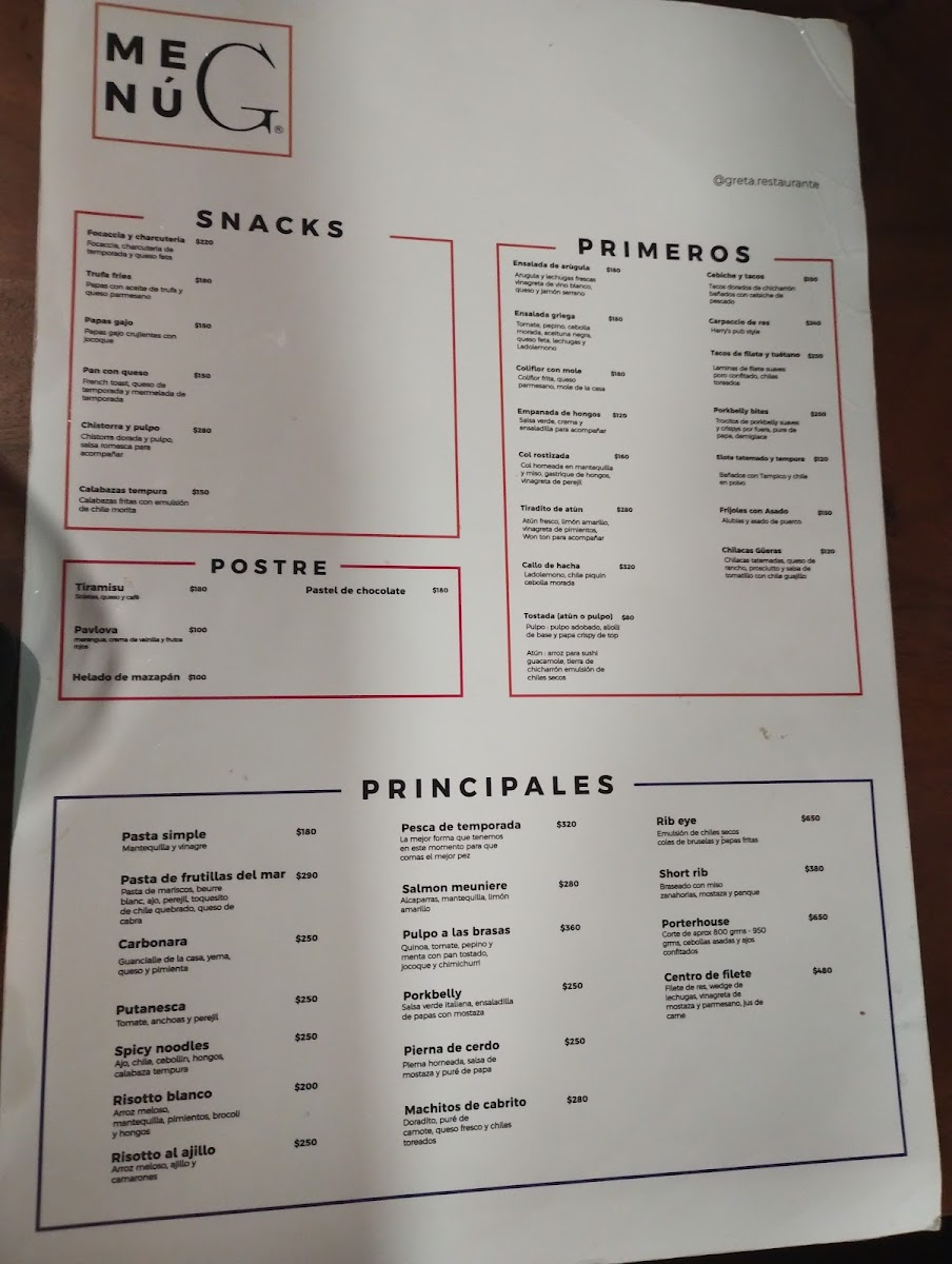Introducing the menu at Greta, a distinguished culinary haven located at Av. Matamoros 78 in Torreon, Mexico. Greta embodies sophistication and creativity, making it an ideal spot for couples and high-end events. With a focus on gourmet cuisine, each dish is meticulously crafted to deliver exquisite flavors in perfect portions.